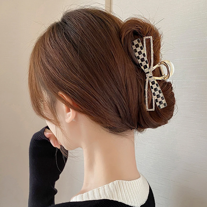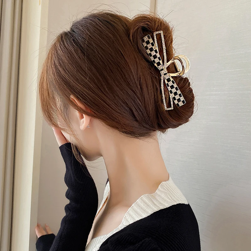 Korean Sweet Girl's Bow Chessboard Pattern Metal Hair Clip 2024 New Headwear For Women's Large Shark Clip Grab Clip Accessories Korean Sweet Girl's Bow Chessboard Pattern Metal Hair Clip 2024 New Headwear For Women's Large Shark Clip Grab Clip Accessories