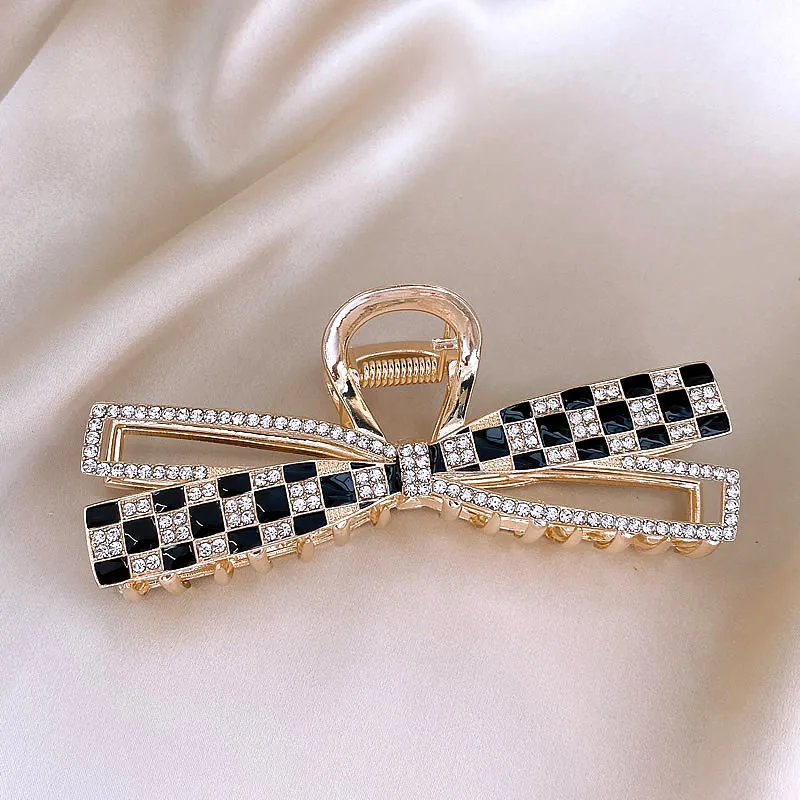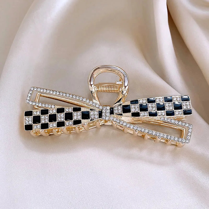• Korean Sweet Girl's Bow Chessboard Pattern Metal Hair Clip 2024 New Headwear For Women's Large Shark Clip Grab Clip Accessories