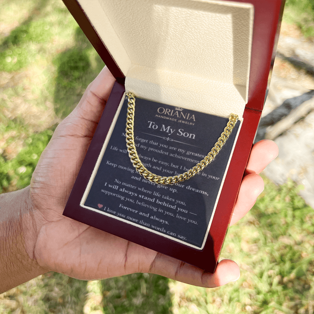 Give your son a timeless piece that reflects strength, confidence, and your unwavering pride. The Oriania Cuban Link Chain is more than a necklace — it’s a statement of love that lasts a lifetime. Crafted in polished stainless steel or 14K gold finish, with an adjustable fit for everyday wear, this chain is designed to elevate his style while carrying your message close to his heart.