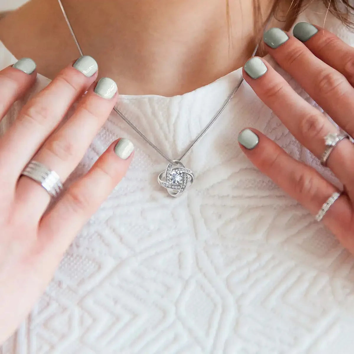 Imagine her reaction receiving this beautiful Love Knot Necklace. Representing an unbreakable bond between two souls, this piece features a beautiful pendant embellished with premium cubic zirconia crystals. Surprise your loved one with this gorgeous gift today!